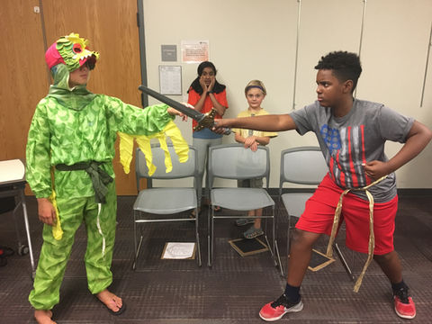 A week- long theatre camp for kids 8-12, meeting each day from 9am to 2pm, culminating in a performance on the last day. The focus is on dramatizing a story, complete with learning lines, characterization, and performing skills to bring a story to life.